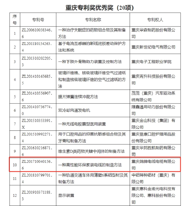 經(jīng)逐級(jí)推薦遴選,在廣泛征求意見(jiàn)、集體研究的基礎(chǔ)上,遴選出50個(gè)集體、50名個(gè)人為重慶市知識(shí)產(chǎn)權(quán)保護(hù)工作先進(jìn)集體和先進(jìn)個(gè)人表彰對(duì)象,35項(xiàng)專(zhuān)利為首屆重慶專(zhuān)利獎(jiǎng)表彰對(duì)象。其中,鴿牌公司“一種高性能環(huán)保家裝電線(xiàn)的制造方法”從上百項(xiàng)專(zhuān)利中脫穎而出,榮獲重慶市首屆專(zhuān)利獎(jiǎng)優(yōu)秀獎(jiǎng)。
