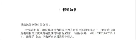 近日,重慶鴿牌電瓷有限公司在國家電網(wǎng)有限公司2024年第四十三批采購(輸變電項(xiàng)目第三次線路裝置性材料招標(biāo)采購)中,成功中標(biāo)2個(gè)標(biāo)包,中標(biāo)金額為1370萬元。