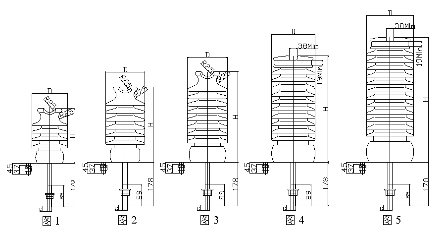 ? ? ? ?R-國標線路柱式瓷絕緣子,后面的數字表示彎曲破壞負荷值kN, ET為外膠裝頂部綁扎型,后綴的數字表示規(guī)定的雷電沖擊耐受電壓峰值kV;L為較長爬電距離,N為標準爬電距離。